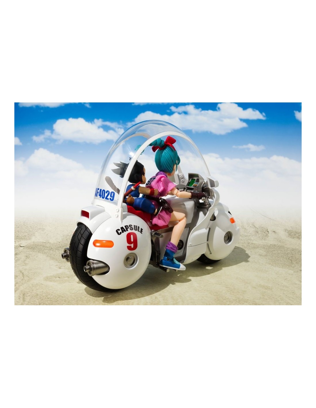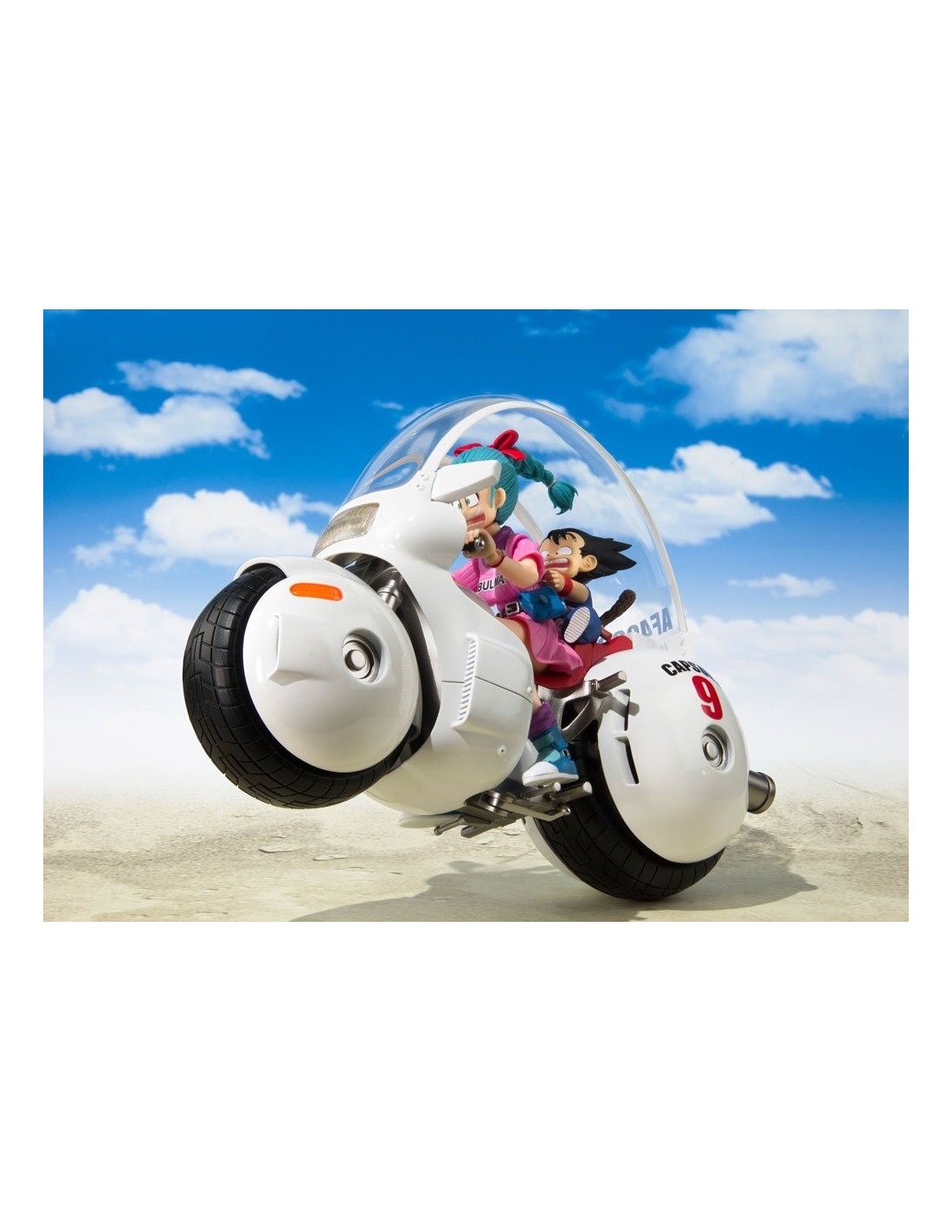 Tamashii Nations presenta para la colección S.H. Figuarts la Bulma’s Motorcycle Hoipoi Capsule nº9, sin duda uno de los vehículos más populares e icónicos del primer episodio de la serie «Dragon Ball». Esta réplica mide unos 17,5 cm de alto y está hecha con partes de PVC y partes de metal. Incluye una base soporte para su exposición con el logo de la Capsule Corp. También incluye: una figura a escala, no articulada, de Goku, una falda opcional y un par de manos alternativas para la SH Figuarts de Bulma (*la figura de Bulma NO ESTÁ INCLUIDA y se vende aparte).