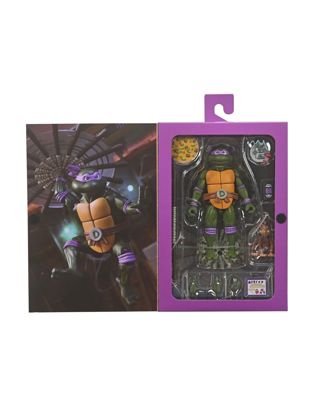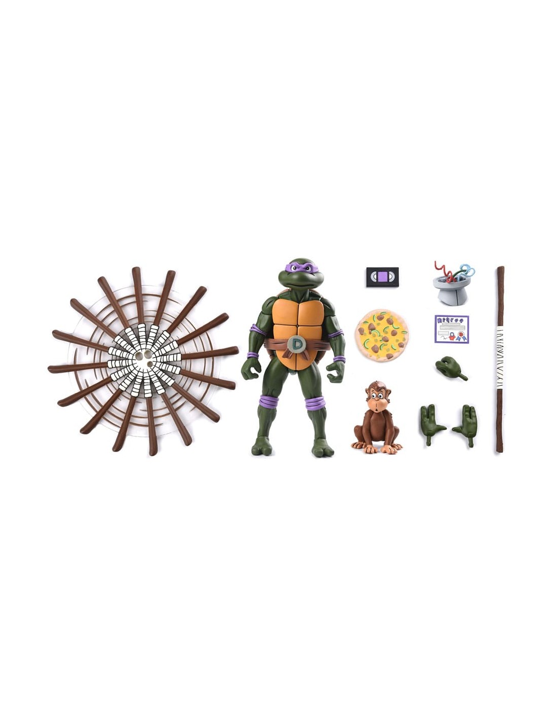 ¡Basado en la clásica serie de dibujos animados de las Tortugas Ninja de los años 80! Donatello trabaja con máquinas y está recibiendo el tratamiento «Ultimate» con esta figura de acción a escala de 7 pulgadas cargada con accesorios. Tiene un bastón bo giratorio, necesario para noquear a Shredder y Foot Clan, además de una pizza de pepinillos y aguacate, mantequilla de maní y más accesorios específicos del episodio. ¡También se incluye una cabeza adicional de Roadkill Rodney que es compatible con la figura de Roadkill Rodney lanzada anteriormente! Viene en un nuevo empaque coleccionable estilo Pizza Club VHS.