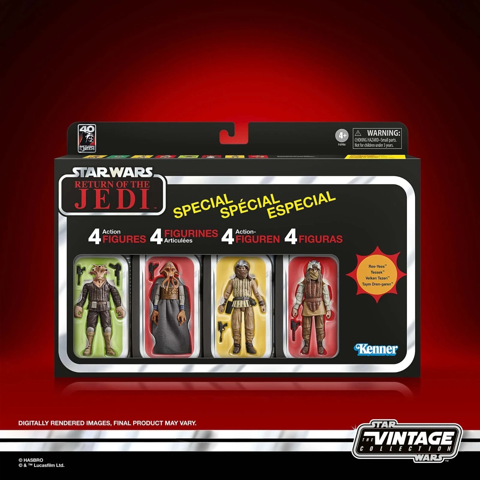 Hasbro añade a la colección The Vintage Collection este set de 4 figuras inspirado en la película «Star Wars: Return of the Jedi» («Star Wars: El retorno del Jedi» en España). El pack reúne a varios integrantes de la corte de Jabba como: Ree-Yees, Tessek, Velken Tezeri, y Taym Dren-garen. Cada figura mide aproximadamente 10 cm y presenta un diseño fiel a su aparición en la película. El set se presenta en una caja con ventana estilo retro, en cuyo interior están los blisters individiales de las 4x figuras articuladas con sus respectivas armas como accesorios (al menos 1x bláster por figura), todo inspirado en los clásicos productos «Star Wars» fabricados por Kenner.